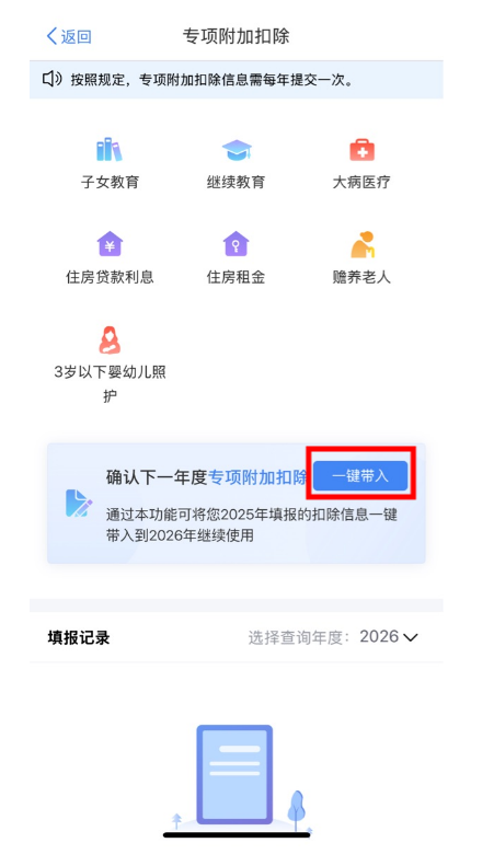 ②选择“一键确认”,依据提示“将带入xx年度(上年度)信息,确认是否继续?”或者“您在xx年度已存在专项附加扣除信息。如果继续确认,将覆盖已存在的专项附加扣除信息!”,确认后点击确定。